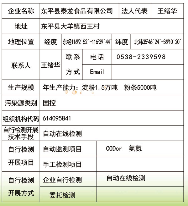 東平縣泰龍食品有限公司環(huán)境信息公開欄