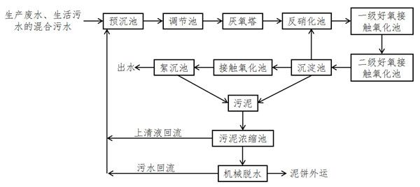 生物接觸氧化法是一種介于活性污泥法與生物濾池兩者之間的生物處理技術(shù),兼具兩者的優(yōu)點(diǎn)。其實(shí)質(zhì)就是在池內(nèi)充填填料,在填料上布滿生物膜,充氧污水與生物膜廣泛接觸,在生物膜上微生物的新陳代謝功能的作用下,污水中有機(jī)物及其它控制指標(biāo)得到去除,污水得到凈化,具有較高的處理效率。接觸氧化池出水進(jìn)入絮沉池,進(jìn)行泥水分離,出水達(dá)標(biāo)排放。